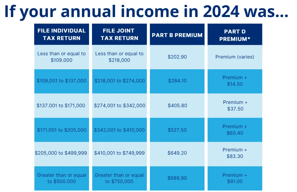 However, if the beneficiary’s modified adjusted income – as reported by their IRS tax return from 2 years before – is above a certain amount, they will pay an Income Related Monthly Adjustment Amount (IRMAA) in addition to their premium.