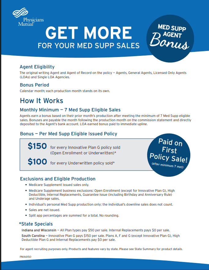 Agents earn a bonus based on their prior month’s production, after meeting the minimum of 7 Med Supp-eligible sales. Bonuses are payable the month following the production month on the commission statement and directly deposited to the Agent’s bank account. LOA earned bonus paid to the immediate upline. See flyer for details.